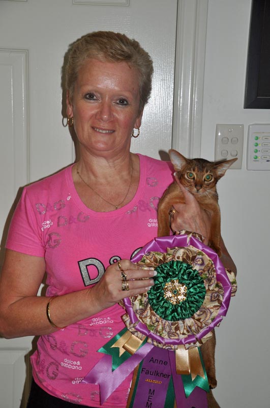 Abys were few but did well at the Sunshine Cat Club show on 17 March. Eileen & Karel Pittaway's Tawny female, Merindalee Morticia, was Best Gr 3 Kitten (out of 22) in Both rings, while their Tawny male, Gr Ch Merindalee Harrison Ford, was Best Gr 3 Cat (out of 16) in one ring, and went on to be Best Gr 3 Exhibit (out of 51) in that ring. Morticia is show below left with Eileen and Harrison below right with Karel.
